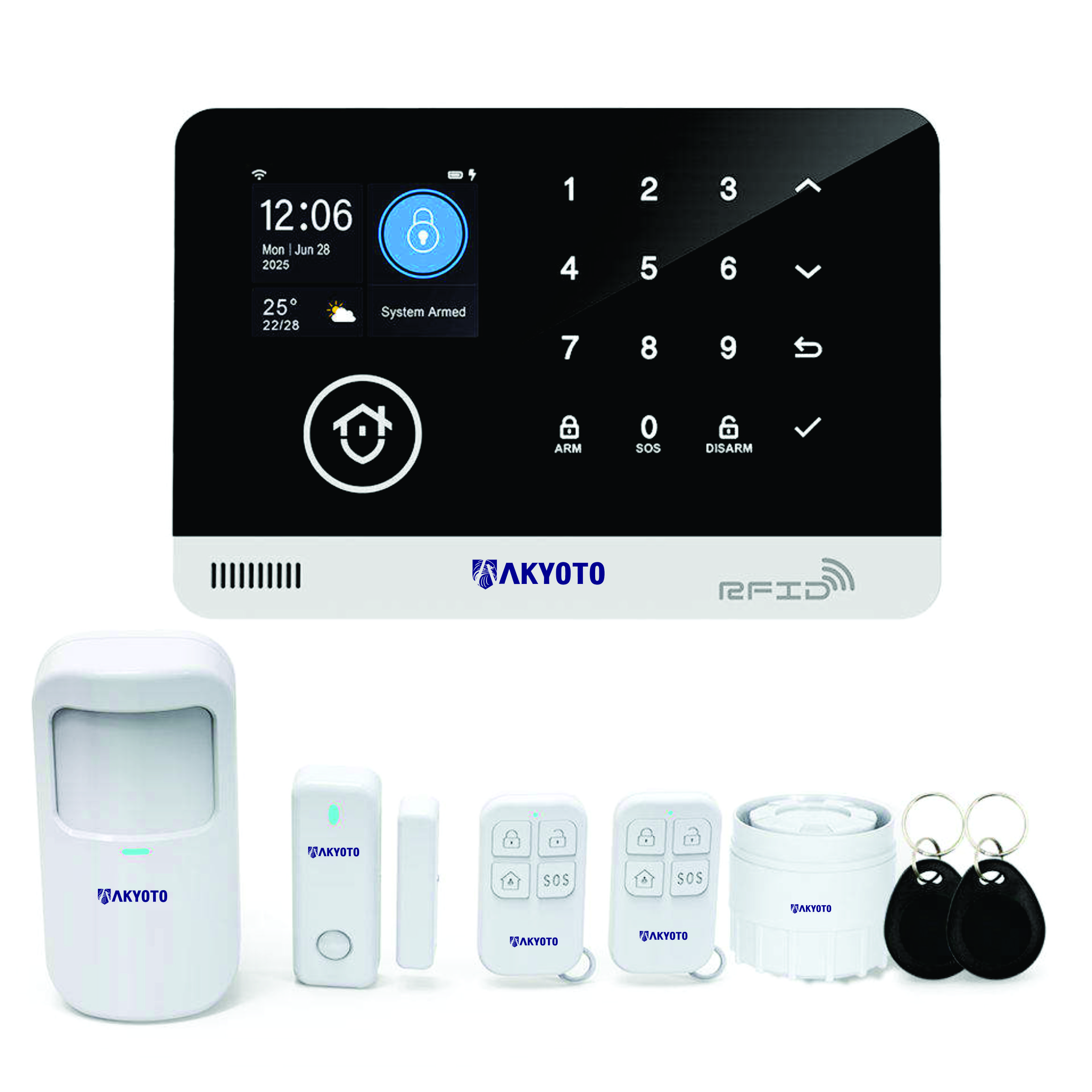 • The Akyoto HSL056 wireless alarm system contains all accessories for immediate installation and use. The package contains 1 wireless motion sensor, 1 wireless door sensor, 2 remote controls,2 RFID tags, and an indoor siren for 110 dB sound alerting.