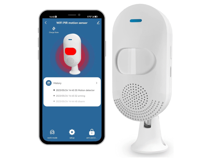 - Instant Alarm Activation: – Detect motion with a 90° sensing angle and trigger a 75dB alarm along with alert notifications on a smartphone via the app.